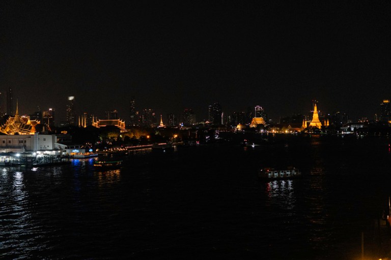 Bangkok at night from our hotel with glowing temples